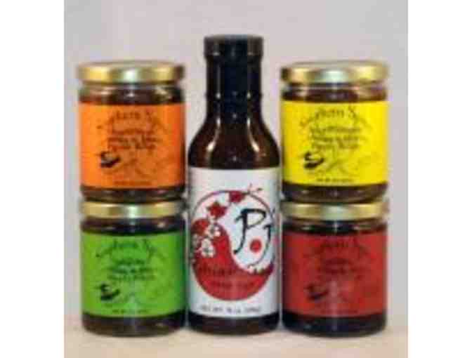 A Southern Spice pack of four, 9-ounce jars of pepper relish and one, 14-ounce bottle of Asian sauce, including: