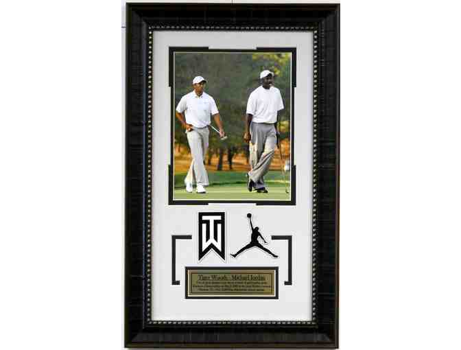 This framed photo captures sports legends Michael Jordan and Tiger Woods playing a round of golf at Quail Hollow. Item includes nameplate, laser cut 3-D Tiger Woods and Air Jordan logos and measures 12x14.