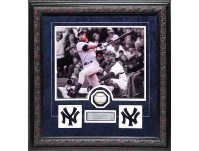 This shadowbox includes a Derek Jeter hand signed official MLB baseball protected and preserved in a professionally designed museum quality shadowbox. Item measures 28x5x38 and includes a certificate of authenticity by Executive Sports Memorabilia.