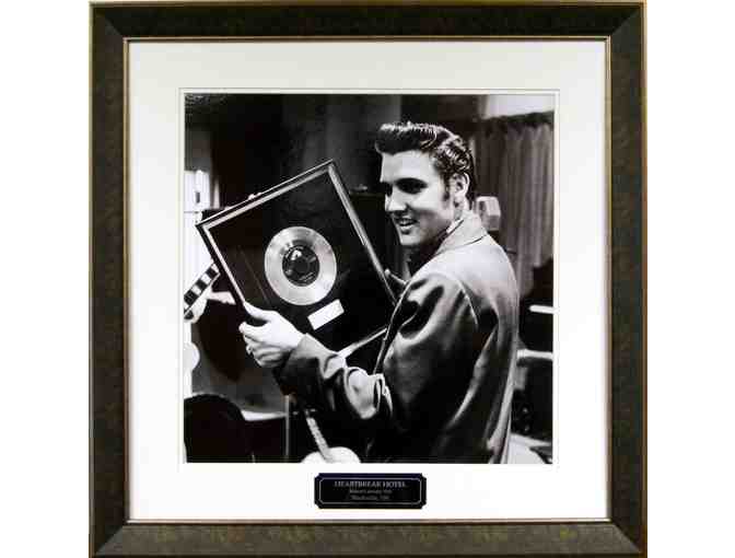 Classic Vintage photograph of Elvis Holding Gold record Heartbreak Hotel recorded January 1956 Nashville, TN. Item comes framed with nameplate and measures 20x20.