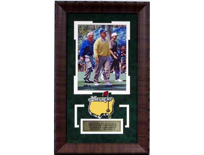 Pictured here teeing off at the 1996 Masters Jack Nicklaus, Tiger Woods and Arnold Palmer. Item comes professionally framed with Masters Logo, nameplate and measures 12x14.