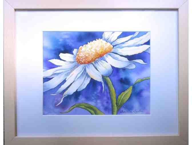 Delighting in the movement and grace of nature, Sunshine Taylor captures the best of both in this original watercolor of a Shasta daisy. Image area 9" x 7", frame 15.5" x 12.5". Signed, with biography on reverse. Ready to hang.