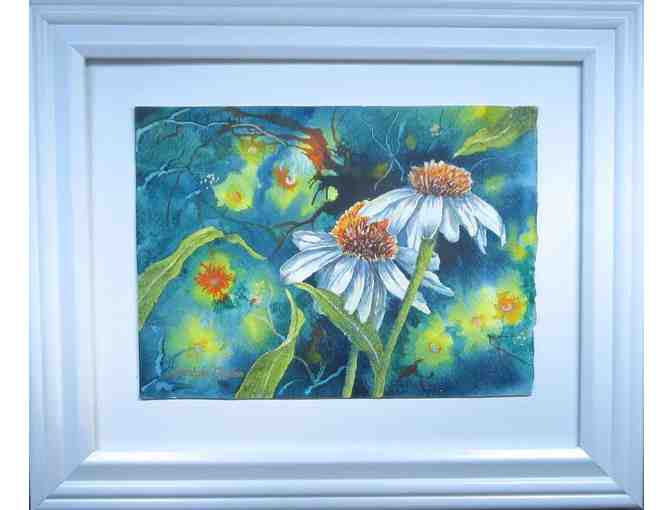 Sparks fly as these two Shasta daisies move in the night sky. Combining watercolor with ink, Sunshine creates magical space for these two lovers. Image area 8" x 6", frame 12" x 10". Signed, with biography on reverse. Ready to hang.