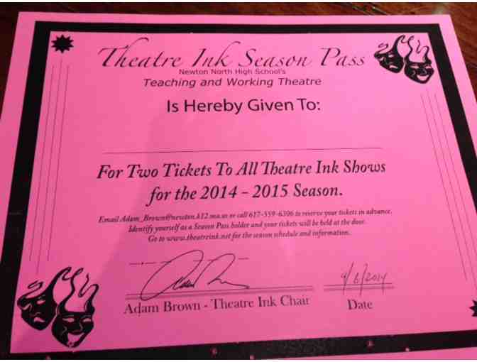 Season pass for two tickets to all Theatre Ink shows for the 2014-2015 season. Theatre Ink is the teaching and working theater of Newton North High School. Next up: "Prelude to a Kiss" December 10-13.