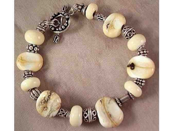 Complete with a splendid toggle clasp, this 7 inch bracelet is a charming mixture of ivory glass and sculptured silver beads. The essence of Deb Rich's artistic expression is revealed in each lampwork bead that she creates in her studio. Deb's beads exhibit her desire to create and inspire change through community outreach. These jewelry pieces are offered exclusively through cMarket to support the fundraising efforts of non-profit organizations. Lampwork glass reflects both the heartfelt passion and interpretative expression of Deb Rich. Her artistic resume includes fantasy sculptures, creatively fashioned from found-objects and recycled materials. Deb's Glass Designs are truly hypnotic, one-of-a-kind pieces that cannot be replicated or manufactured by a machine, so items may differ slightly from photos. Deb only sells jewelry pieces that capture the grace and flow of glass artistry. All jewelry is made with sterling silver or copper findings, Czech or Swarovski Crystals, and various complementary beads, making Deb's Glass Designs positively the best choice.