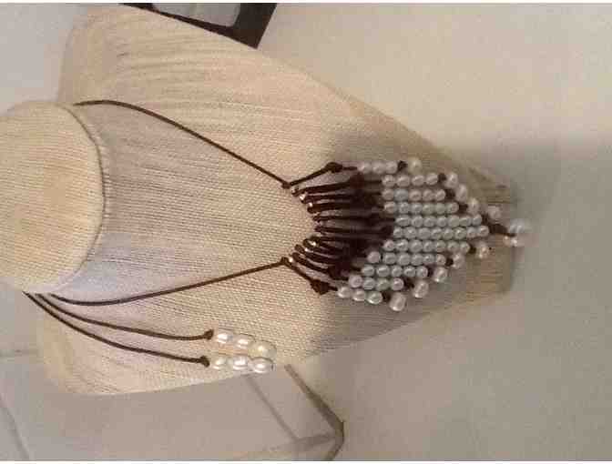 Any lady would love this handcrafted leather and freshwater pearl necklace from Beach Gurl Design.  74 fresh water pearls and one large Fireball Barquoe freshwater pearl appear to cascade attractively down.  Adjustable to long or choker.
