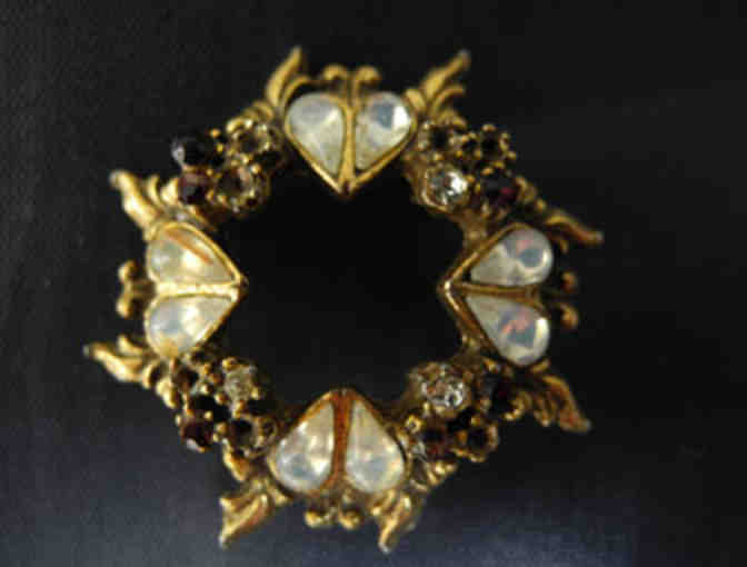 1.25" diameter circular pin with 8 opalescent teardrop shaped stones placed to form 4 hearts. The hearts are surrounded by filagreed gold-toned metal and 9 tiny clear and garnet-colored jewels.