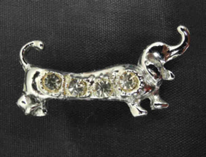 Silver-toned dachshund pin with 4 glass jewels set in its torso. The pin is 1.5" long.