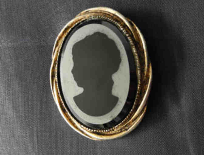 A black silhouette of a woman's head and shoulders is centered on a dark grey mirrored oval with a beveled edge. The oval is held in a swirling metal frame. Dimensions are 1 7/8 inches by 1 1/2 inches.