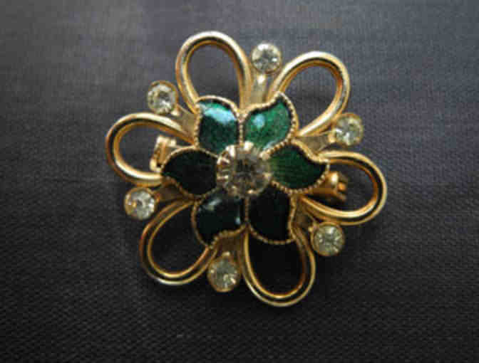 A diamond-like stone is set in the center of 6 green enameled leaves and 6 looped gold-toned petals with smaller crystals set between each petal. It's 1 1/8th inch in diameter