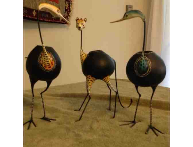 These handcrafted whimsical Candlestick Holders are 10" tall and the bodies of each are approxiimately 4" wide. This set was recently purchased from a local artisan in the Maasai Market in Nairobi.