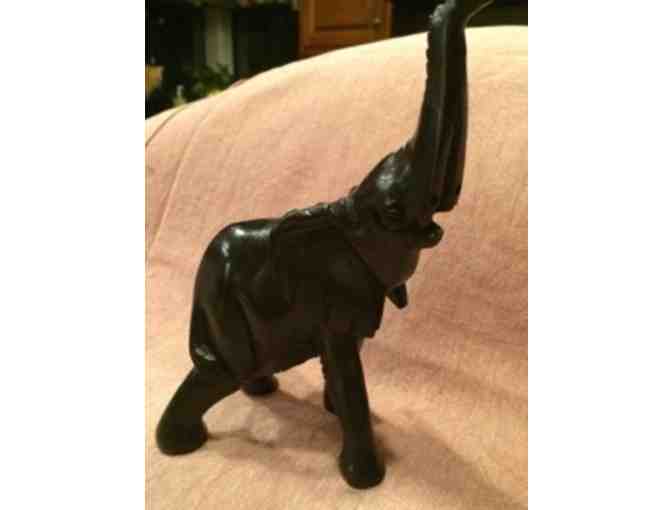 This African Ebony Hand-Carved and Polished Elephant has its' trunk held high for good luck! This item was recently purchased from a local artisan in the Maasai Market in Nairobi.