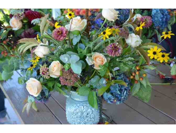 We choose the best seasonal flowers and foliage, make an arrangement every day, and offer arrangements in 3 sizes. Up for bid: one medium size arrangement in a vase. We promise to exceed your expectations with our lush, creative arrangement!