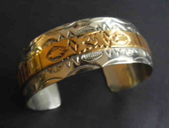 This bracelet has a stamped design and a contrasting gold-toned metal strip attached to the front. "B B" and "2 sterling 2" are stamped on the inside.