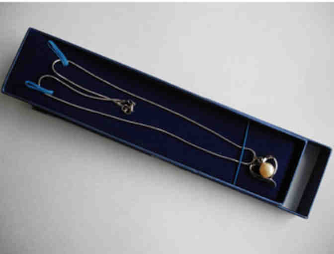 The chain is silver-toned and 18 inches long. The pendant is a silver-toned abstract heart holding a faux pearl with a pinkish opalescence. The gift box is lined in blue velveteen.