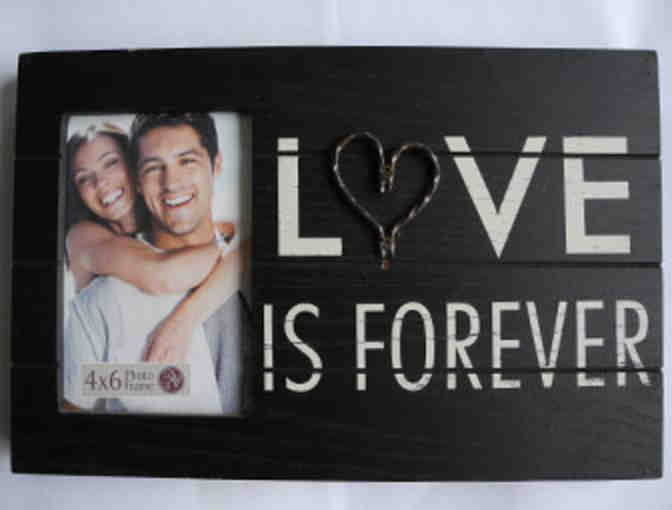 8" X 12" black imitation wood frame, with the words "Love is Forever," holds a 4" X 6" photo. It can be hung or can sit on a shelf or table.