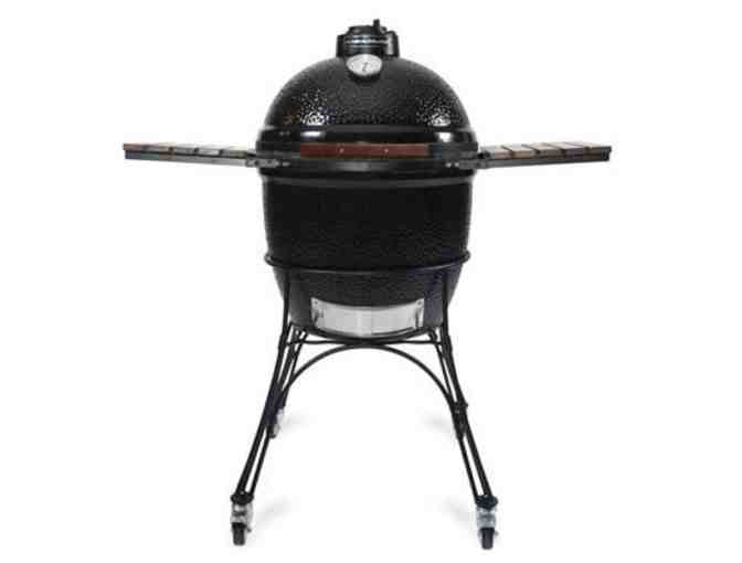 The Kamado Joe standard configuration Includes a powder coated cast iron cart with locking casters, and finished bamboo side shelves. The black grill has "teak finished" bamboo, and the red grill comes with "natural finished" bamboo. A stand alone configuration is also available for intended use in grill tables and outdoor kitchens. This stand alone version is available with either black powder coated galvanized steel or stainless steel bands and hinge for a sleek appearance.