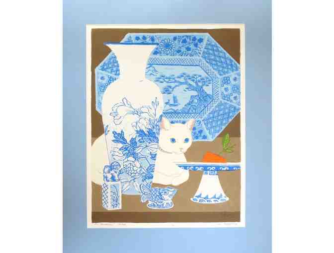 Dorr began teaching at the Mendocino Art Center in 1960. Throughout her long career, Dorr had a fearless approach to life and art. Her body of work reflects influences as broad as Samoan, African, Collage, Coastal Views and… CATS! Here we have a refined kitty, surrounded by classic Asian/Flow Blue China designs. A true "Connoisseur," for sure! Original serigraph numbered 26/28, signed by the artist. Matted measures 19" x 23", with an image area of 14" x 18".