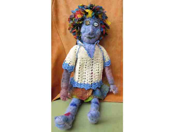 Mendocino Art Center's Fibre Arts Director Mickie McCormic creates crazy good dolls for your tactile enjoyment. Employing felting skills, and stitchery of all kinds, Mickie adorns these captivating dolls with buttons, krazy hair and wild clothes. Confetti wears a vintage potholder as her shirt, and has a flouncy felted skirt. Felted rosette cheeks, mis-matched button eyes, and WILD, multi-colored ribbon hair. Confetti charms her way into your heart. 17" long.