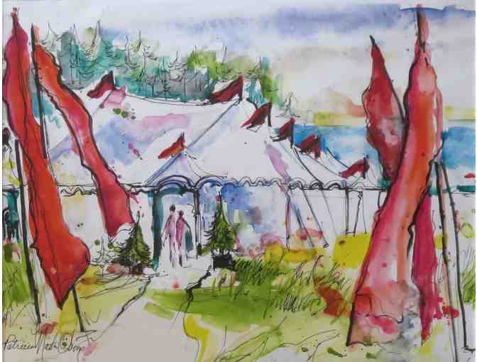 Accomplished watercolorist and frequent teacher at the Mendocino Art Center, Patricia has captured the energy and excitement of the annual Mendocino Music Festival held every July in a big white tent on the Mendocino Headlands. With banners flying and music filling the air, the viewer is transported back to the Mendocino Coast. Subtitled "Play it Again," this matted watercolor print measures 20" x 16", with an image size of 13.5" x 10.5".