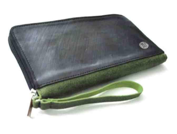 Sapia, an organization practicing fair trade principles in Bogota, works with artisans from Colombia's low-income and internally displaced populations. The Urban Zip Wallet is made from textured distressed leather and tire tube with overall zipper closure. Inside 16 CC slots, 2 bill pockets and zipper change purse. Includes Made in Barrio Metal button.