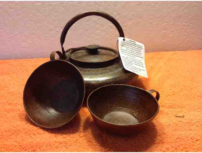 This hand-pounded copper tea set (tea pot and 2 cups) was created by women at the Association for Craft Producers (ACP) in Katmandu, Nepal. ACP is a women's craft center established to provide low income or abandoned women with employment and training in traditional skills.