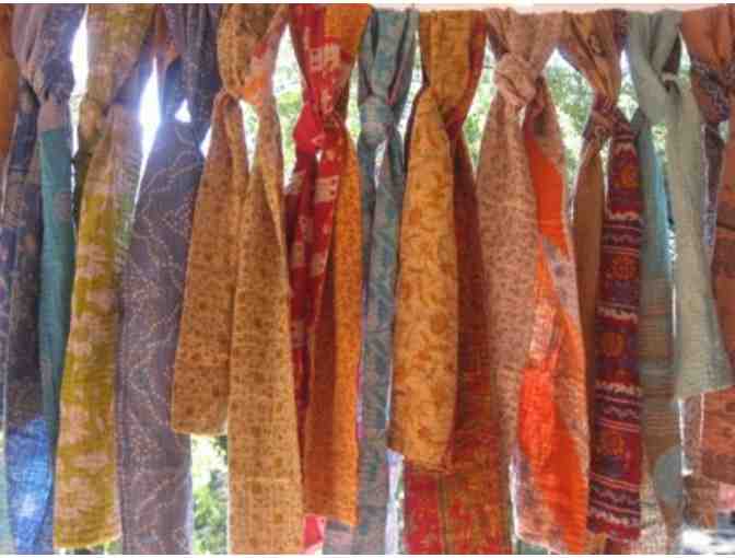 This is a unique, beautiful, and one-of-a-kind scarf from Asha. Asha's products provide hope to the men and women that live in the slums of India. Asha works in conjunction with a non-profit organization in Calcutta named Connexions that trains and employs families out of the slum districts to create these beautiful Sari Products. This scarf was hand sewn and comes with a story of freedom and redemption.