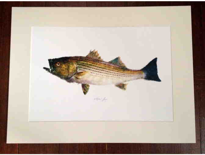 This is a beautiful fish print of a Striped Bass from one of our favorite artists, Joe Higgins. Visiting Joe's Fished Impressions in Salem (a.k.a Joe's Fresh Fish Prints) is a little overwhelming because every one of his pieces is different and gorgeous. We highly recommend visiting Joe yourself at 104 Wharf Street in Salem (he shares space with Tomo's tackle shop, for you fishermen and women) - his work is truly stunning. If you're lucky, you'll find him working on a print, and witness this artist in action!