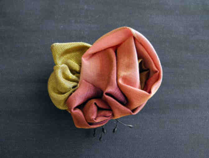 Silk fabric in an ombre of dusty purplish-pink to a peachy-gold which measures 1.2" x 1.75". A gold-green silk "leaf" is attached and it's mounted on a gold-toned backing with a pin.