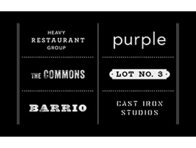 Enjoy Lunch or Brunch at one of Heavy Restaurant Group's fine establishments, including Purple, Barrio, Lot No. 3, The Commons, and Cast Iron Studios. This voucher is valid Saturday-Thursday for up to $40 worth of food and drinks.