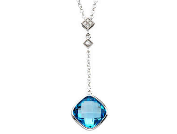 Elegant necklace in 14k white gold, diamonds and Swiss Blue Topaz! This eye-catching "Big Blue Droplet" necklace is captivating! 5ct of beautiful checkerboard Swiss Blue Topaz surrounded by 14k white gold and highlighted by genuine diamonds. This fabulous necklace is timeless, yet modern and adds fabulous color and style! It is a perfect match with the earrings, also available. Gift box included.