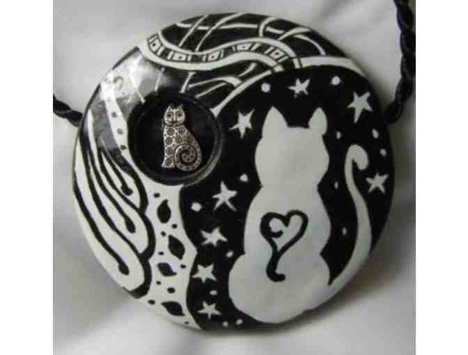 Lovely black and white design pendant with a cat on it strung on black beads.