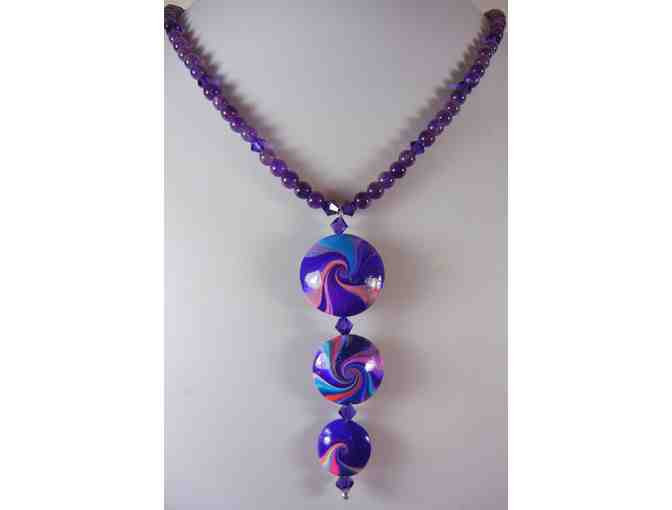 The three large centerpiece beads are each created by hand using a special spinning technique thus giving each one a different effect. Natural Amethyst gemstone beads are paired with Swarovski crystals in a deep purple shade to highlight the design.