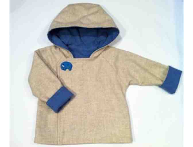 This particular cute and very comfortable reversible spring jacket is made of wool nylon & cotton. The design details are precious, including the handmade buttons shaped like an elephant and an acorn.