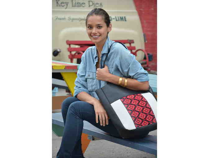 Catrinka's signature leather and textile tote is updated with a gorgeous textile in this season's must-have color: bold red.