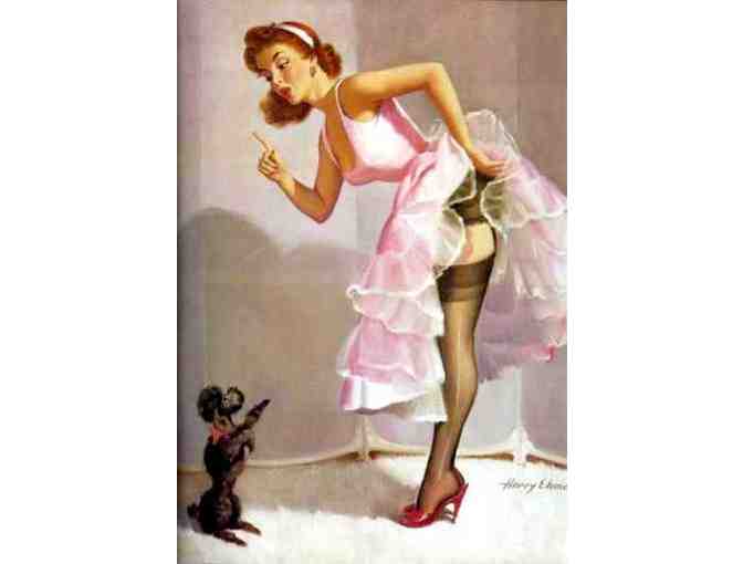 Harry Eckman began his career in commercial art as an assistant to Gil Elvgren in the early 1940s. Eventually, Ekman began painting his own pin-up and glamour girl subjects for various national calendar companies. It was often said that unless one looked closely at the signature on an Ekman painting, it could easily be confused with an Elvgren because Ekman’s work and brush strokes so closely resembled those if his mentor. Artists Joyce Ballantyne and Al Buell also shared the joy of having their work confused with and compared to that of their influential teacher.