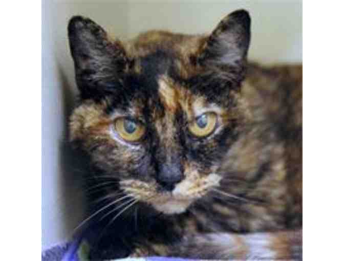 Love older cats? Kinsee is a sweet senior tortoiseshell who was living on handouts in Pacific Grove after being abandoned by her owner. A concerned neighbor became alarmed when she noticed 13-year-old Kinsee had a huge abscessed wound on her neck after being attacked by a dog or raccoon. Kinsee's wound was surgically repaired, and happily she has made a wonderful recovery. Like many senior cats, Kinsee has some kidney issues and is on a special diet. She also requires subcutaneous fluids every other day. We'd love to help this sweet cat find some love and comfort in her golden years. Meet her at the AFRP Adoption Center in Pacific Grove.