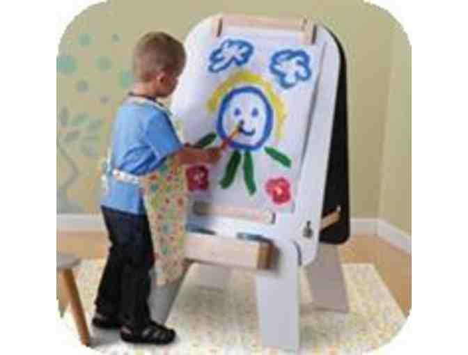 Young artists will love this solid-wood constructed 42" H. easel from U.S. Toy. With clips to hold paper on one side and a chalkboard surface on the other, this two-sided easel lets children create in many different mediums. Storage trays hold all supplies and easel folds for easy storage. Ages 12 mos. +. A value of $100!