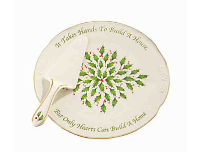 Enjoy some sentiment with your sweets. This Lenox holiday cake plate and server set looks lovely as crafted from fine ivory porcelain with gold accents. The Lenox holiday holly and berry motif marks each piece for more festive cheer, while the plate bears the saying, "It Takes Hands To Build A House, But Only Hearts Can Build A Home." From the Lenox Holiday Collection.