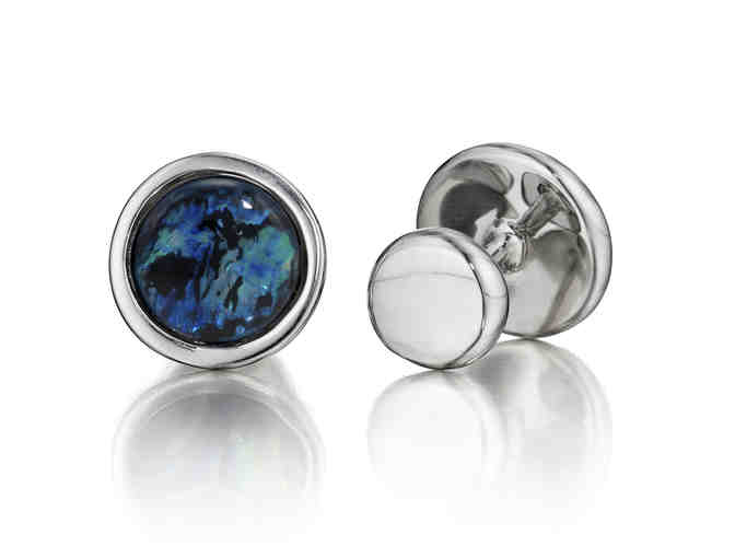 Sterling silver Circle cufflinks set with blue/green abalone.