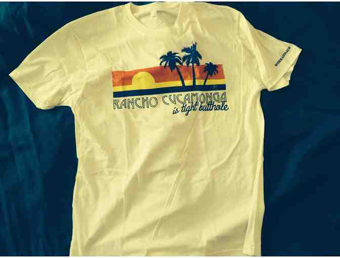 This super soft 100% cotton, cream colored t-shirt, size Large, features the "Rancho Cucamonga" sunset of popular sitcom series Workaholics and the Comedy Central logo on the back collar.