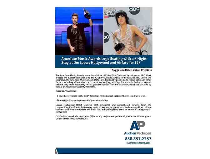 - 2 Loge Level Tickets to the 2015 American Music Awards in November in Los Angeles, CA