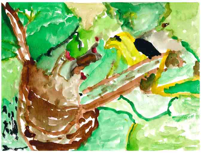 "It's a picture of a mama bird and three baby birds." Kathryn had never painted before moving to Lakewood Village but has since become a confident and dedicated artist."