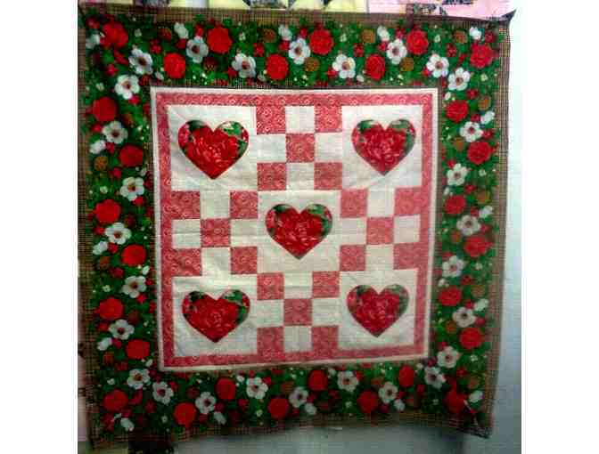 Add a warm touch to any room with this quilted heart wall hanging! This quilted wall hanging is 37 x 37 inches. The binding is green with small green hearts stitching it in place. A wonderful gift for you or someone you care about. It is made of cotton fabrics and is machine washable in cold water on gentle cycle.