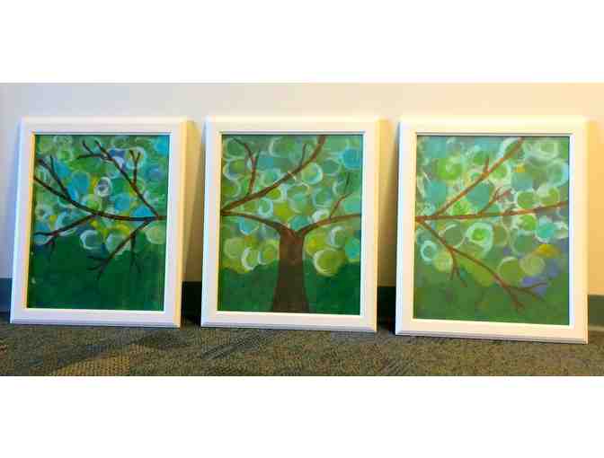 Bid on this beautiful three-piece Tree of Life painting by students in the Early Learning Center and The Grace School at Meeting Street!  It symbolizes growth, life, vitality and strength and serves as a reminder of our past (strong, deep roots - ancestry), present (tree body - knots included) and future (fruit – labor and posterity).  The white frames and serene palette of earthy greens, blue, and brown will surely compliment your home or office.