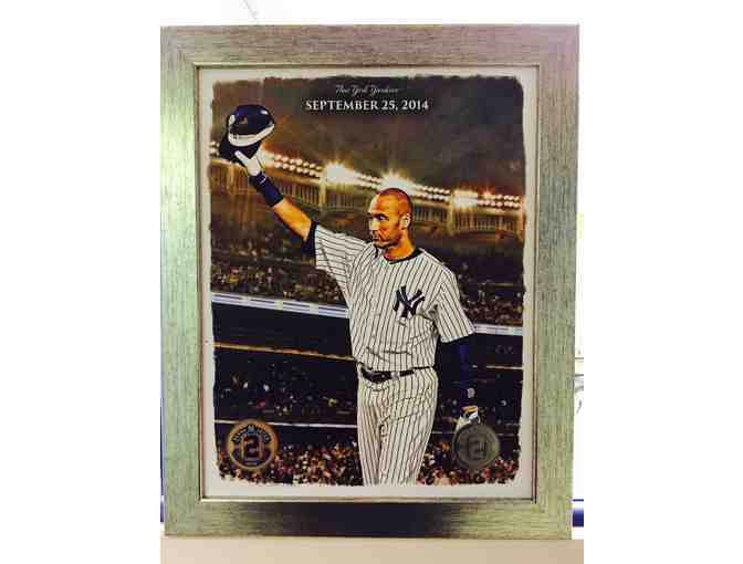 Item includes a painting of Derek Jeter bidding farewell to Yankee Stadium on September 25, 2014 along with authentic Yankee Stadium dirt from his final game.