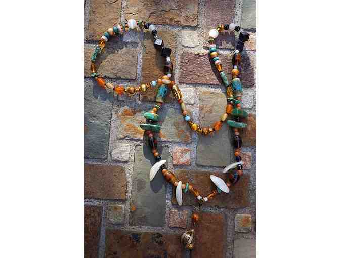 The winning bidder adds this unique handcrafted beaded 26" necklace to their jewelry collection. The beads used are ceramic, fiber optic, turquoise, wood, mother of pearl shell, copper, plastic, and crystals.