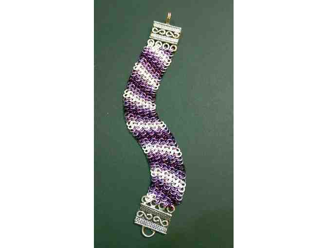 This handmade bracelet was created using hundreds of individually wrapped links connected to mimic a chainmaille pattern. The lavender, purple and white diagonal pattern make this a great accessory for both your casual and formal outfits.