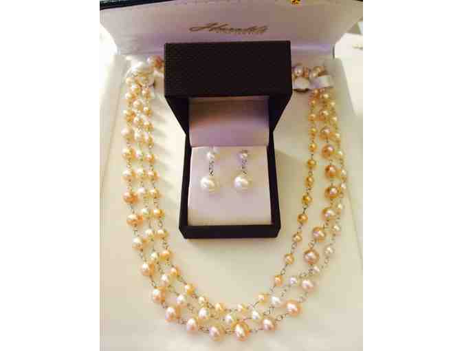 Valentines' Day just got easier. Your sweety will love you even more when you surprise her with this lovely sterling and fresh water pearl drop earrings and three strand pastel-colored pearl necklace set. The pearls are fresh water and the necklace is sterling silver. Don't miss out on this amazing set.