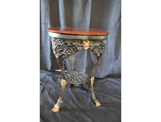 Spruce up his mancave with this Scottish iron pub table with pierced filigree apron and claw feet. Beer never tasted so good around this little gem. The iron table has gold flecked accents on the knees, feet and sides. Circa 1900